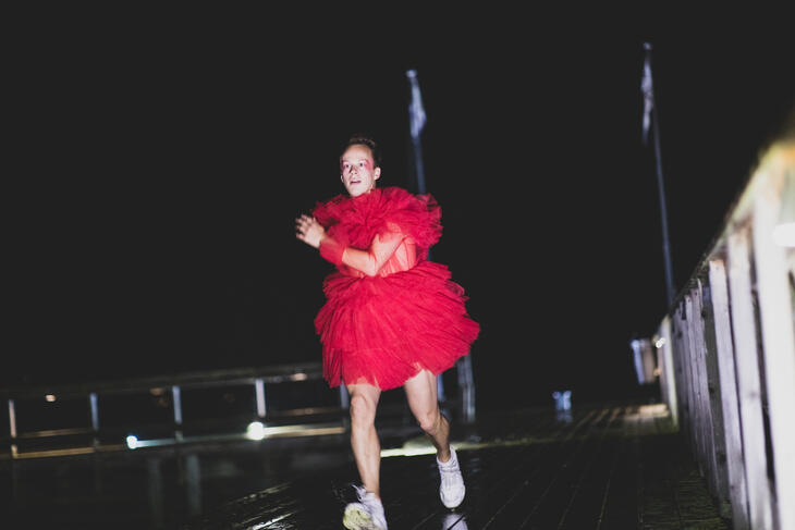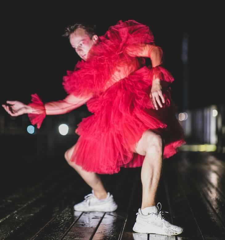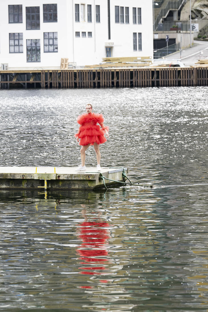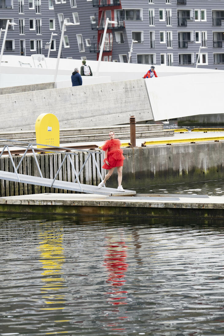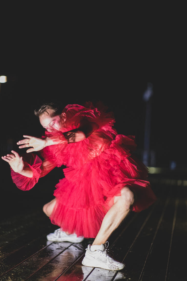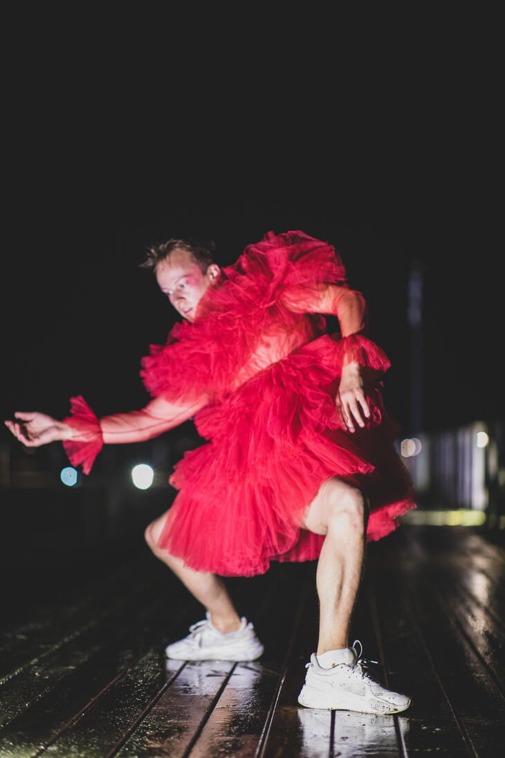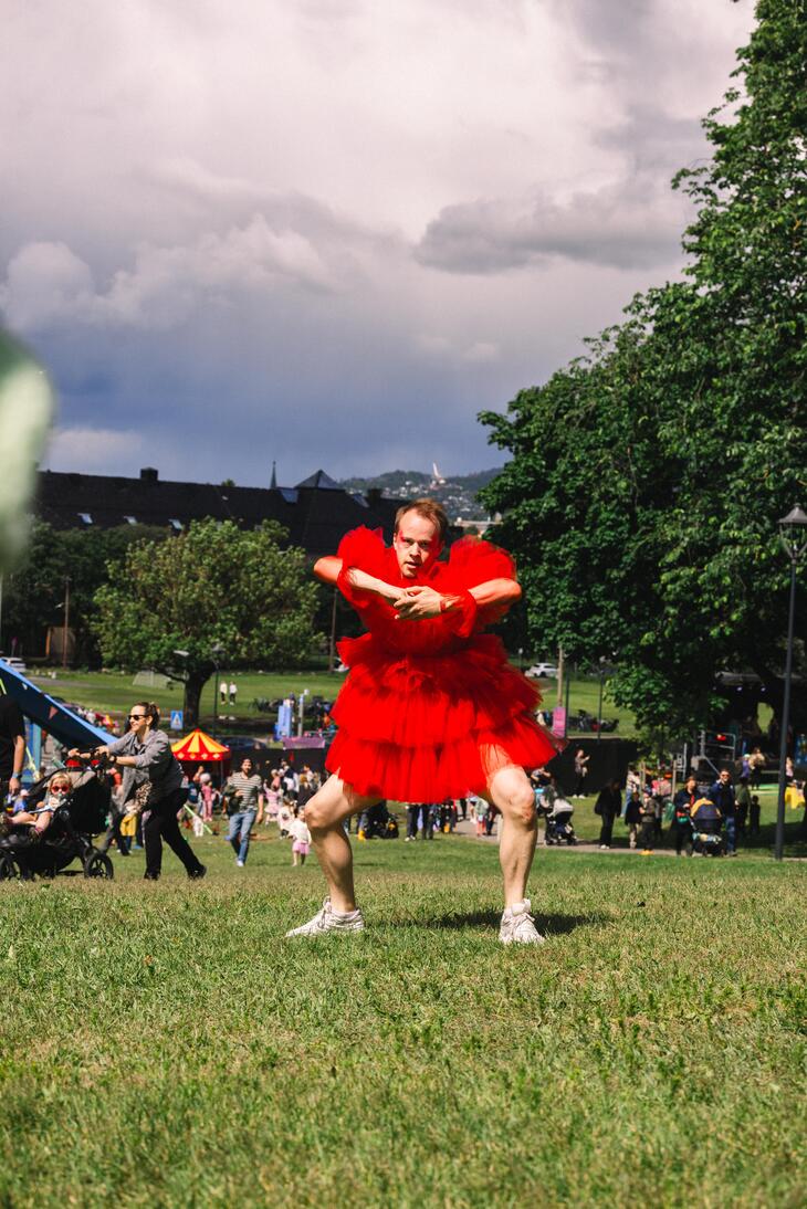 Engebretsen dukker plutselig opp blant publikum i et kostyme som stikker seg ut blant alle de mørke allværsjakkene: en kort, luftig, mørkerød tyllkjole og hvite joggesko.